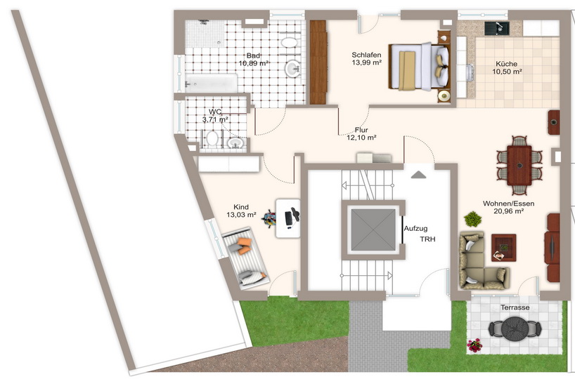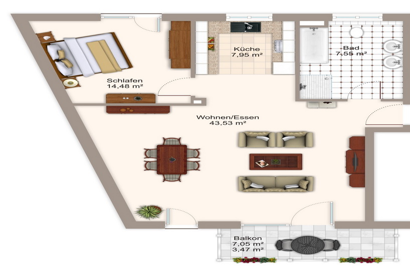 多户住宅提供连续的窗户和一个露台,开放式厨房和客用卫生间。